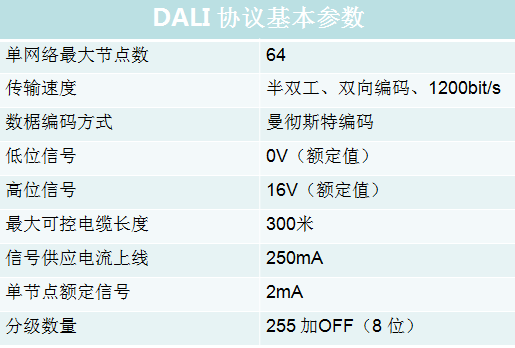 DALI数字式可寻址灯光接口(Digital Addressable Lighting Interface)镇流器是当前最新的可调光荧光灯镇流器。DALI是一个数据传输的协议,它定义了电子镇流器与设备控制器之间的通信方式,基于DALI 协议组建的系统具有分布式智能模块, 各个智能化DALI 模块都具有数字控制和数字通信能力, 地址和灯光场景信息等都存储于各个DALI 模块的存储器内。DALI 模块通过DALI 总线进行数字通信、传递指令和状态信息,实现灯的开关、调光控制、系统的设置等功能。DALI总线制定一个系统结构简单、安装方便、操作容易、功能良优的灯光控制系统,可用于一个房间内的灯光控制,还可以连接更高级的设备网络,如以太网,以支持更多的设备和足够的网络带宽。 DALI协议的基本参数如下。